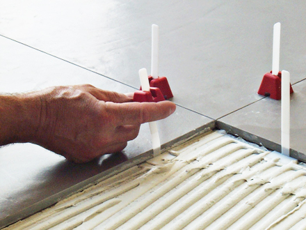 Das patentierte System "TLS" (TUSCAN LEVELING SYSTEM) aus den USA fixiert bei einfachster Handhabung jede einzelne zu verlegende großformatige Fliese (ab 30 x 60 bzw. 50 x 50 cm) fugengenau bis zur Festigung der Klebemasse. Damit werden sowohl die Kalibrierung der Platten, als auch kleine Unebenheiten im Material und in der Spachtelung ausgeglichen, so dass eine absolut ebene Oberfläche des Belages bei gleichbleibenden Fugenabständen erreicht wird. Die leichte Handhabung des Systems führt zudem zu einer deutlichen Zeiteinsparung für den Fliesenleger, die bei größeren Flächen ab 70 qm ca. 25% beträgt.